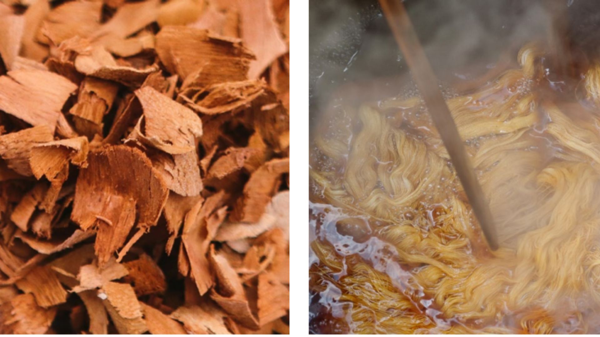 1. สับเปลือกด้านในให้เป็นชิ้นเล็กๆ หรือถ้าใช้ใบ ควรใช้ใบสดแก่ ฉีกหรือสับให้ละเอียด แล้วนําไป ต้มจนน้ำเดือด ใช้เวลาประมาณ 1 ชั่วโมง กรองเอาน้ำย้อมออก