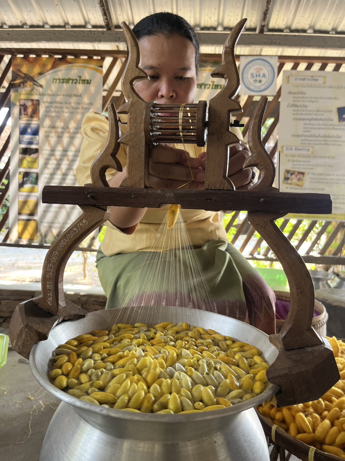 เมื่อหนอนไหมโตเต็มที่และเริ่มสร้างรัง การสาวไหมจึงเริ่มต้นขึ้น การสาวไหมเป็นกระบวนการดึงเส้นใยไหมออกจากรังไหม ซึ่งต้องการความชำนาญและความละเอียดในการทำงานอย่างมาก ในวิดีโอได้แสดงให้เห็นถึงกระบวนการสาวไหมแบบดั้งเดิมที่ยังคงใช้ในปัจจุบัน