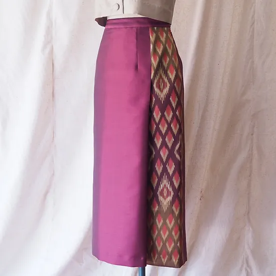 กระโปรงผ้าไหม ตัดสำเร็จ ผ้าไหมสีพื้นแทรกลายผ้าไหมมัดหมี่ ไซส์ L เฉดสีม่วงอมชมพู รหัส WM-CT-SKU102458