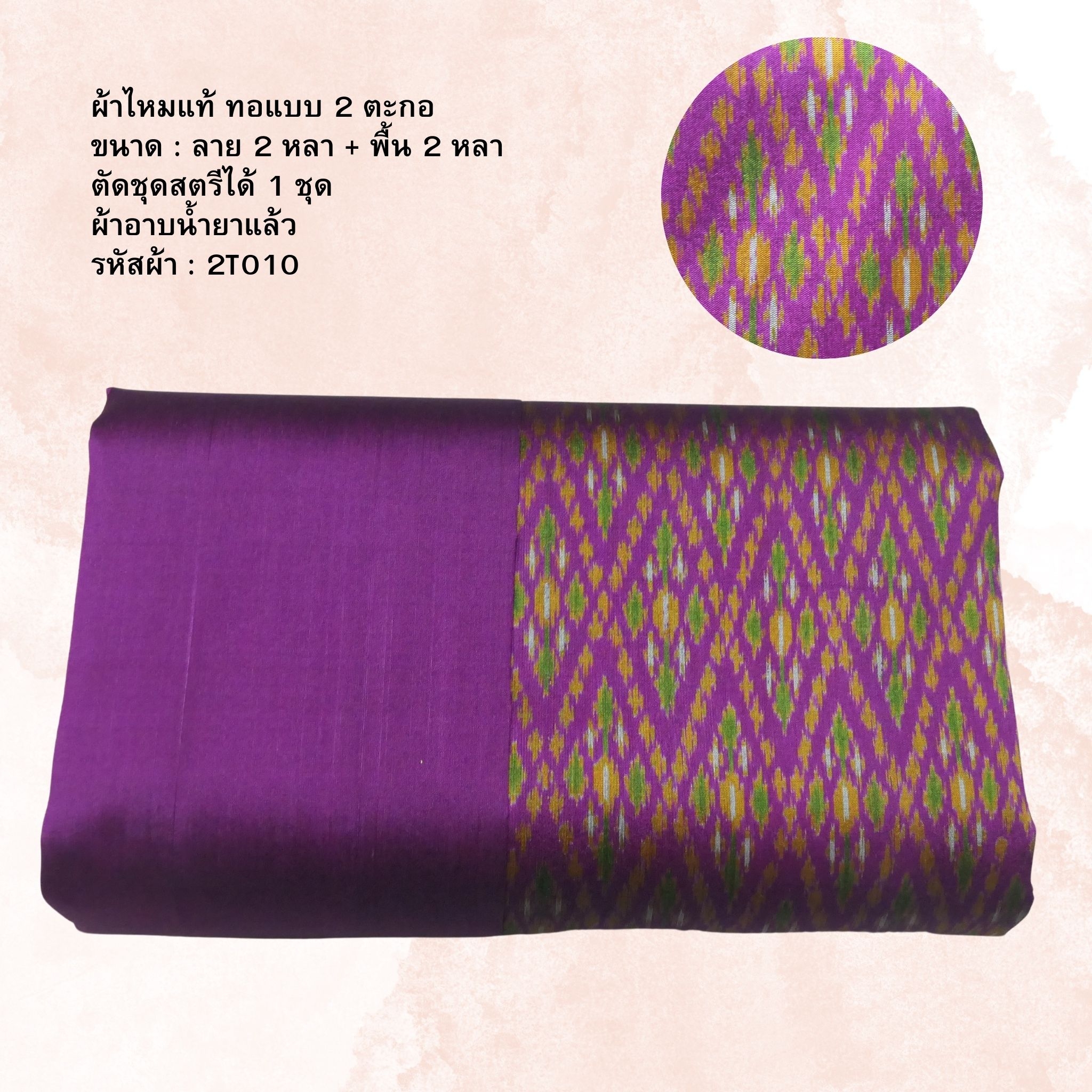 (ผ้าชุด)ไหมมัดหมี่ สองตะกอ ไหมแท้ (ผ้าลาย2หลา+สีพื้น2หลา) สีม่วง รหัส M2B-NY-2T010