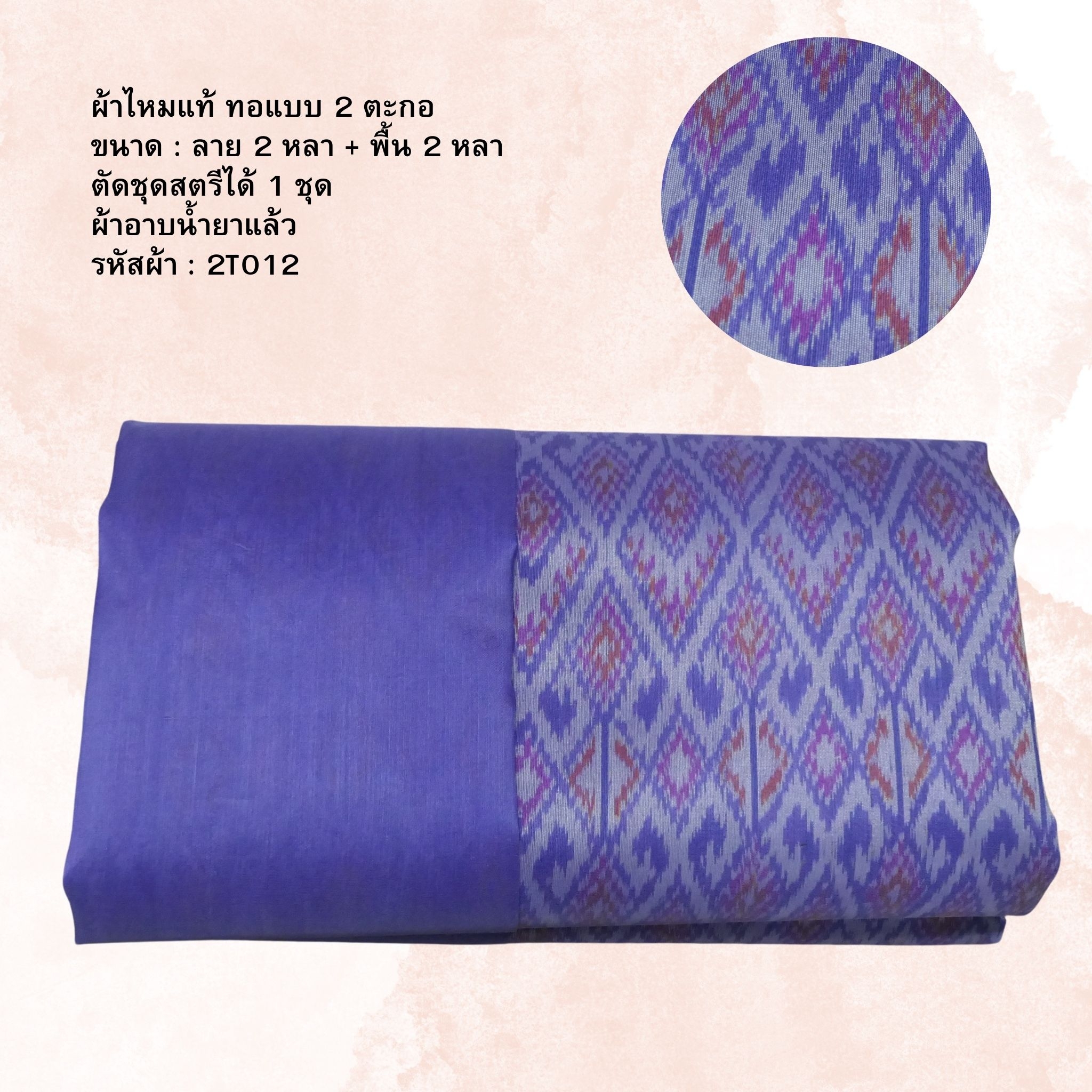 (ผ้าชุด)ไหมมัดหมี่ สองตะกอ ไหมแท้ (ผ้าลาย2หลา+สีพื้น2หลา) สีม่วง รหัส M2B-NY-2T012