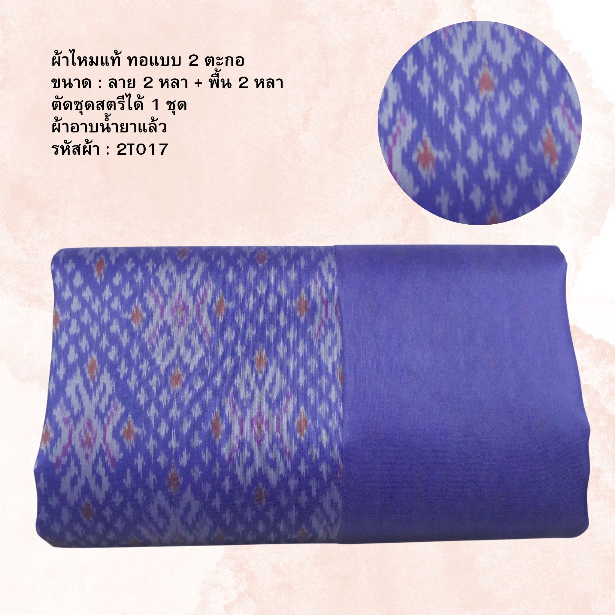 (ผ้าชุด)ไหมมัดหมี่ สองตะกอ ไหมแท้ (ผ้าลาย2หลา+สีพื้น2หลา) สีม่วง รหัส M2B-NY-2T017